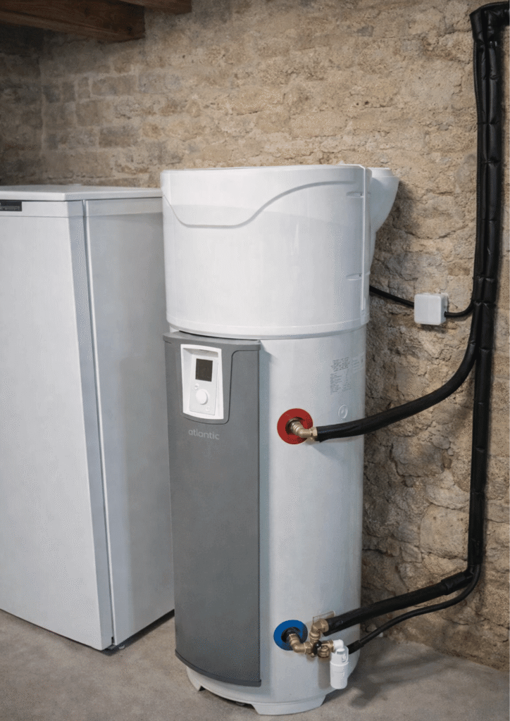 Le ballon thermodynamique à air ambiant produit l’eau chaude sanitaire en captant l’air du local. Une pompe à chaleur intégrée récupère les calories de l’air intérieur (garage, buanderie, cellier), puis chauffe et stocke l’eau. Il fonctionne sans unité extérieure, mais demande un volume d’air suffisant et une bonne ventilation.